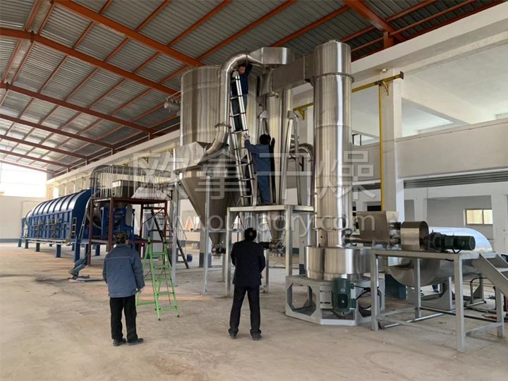 熱空氣切線進入干燥器底部,在攪拌器帶動下形成強有力的旋轉(zhuǎn)風(fēng)場。膏狀物料由螺旋加料器進入干燥器內(nèi),在高速旋轉(zhuǎn)攪拌槳的強烈作用下,物料受撞擊、磨擦及剪切力的作用下得到分散,塊狀物料迅速粉碎,與熱空氣充分接觸、受熱、干燥。脫水后的干物料隨熱氣流上升,分級環(huán)將大顆粒截留,小顆粒從環(huán)中心排出干燥器外,由旋風(fēng)分離器和除塵器回收,未干透或大塊物料受離心力作用甩向器壁,重新落到底部被粉碎干燥。