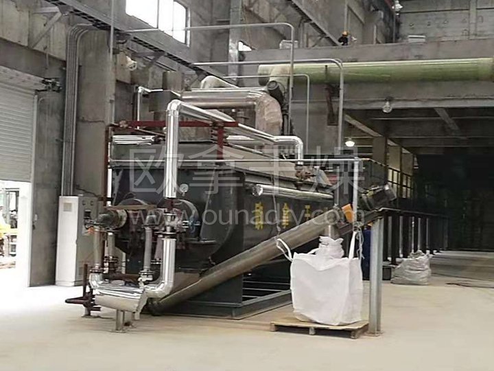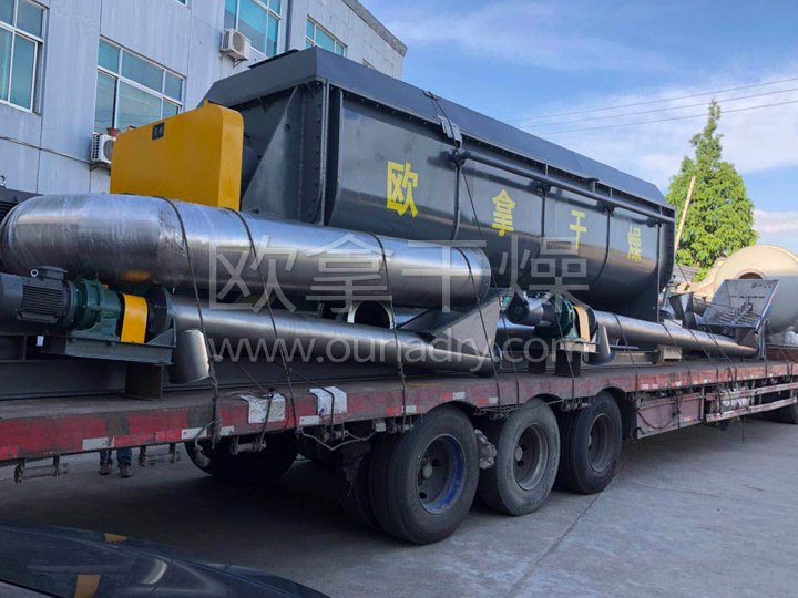 空心軸上密集排列著楔型中空槳葉,熱介質(zhì)經(jīng)空心軸流經(jīng)槳葉。單位有效容積內(nèi)傳熱面積很大,熱介質(zhì)溫度從-40℃到320℃,可以是水蒸汽,也可以是液體型:如熱水、導(dǎo)熱油等。間接傳導(dǎo)加熱,沒有攜帶空氣帶走熱量,熱量均用來加熱物料。熱量損失僅為通過器體保溫層向環(huán)境的散熱。楔型槳葉傳熱面具有自清潔功能。物料顆粒與楔型面的相對(duì)運(yùn)動(dòng)產(chǎn)生洗刷作用,能夠洗刷掉楔型面上附著物料,使運(yùn)轉(zhuǎn)中一直保持著清潔的傳熱面。槳葉干燥機(jī)的殼體為Ω型,殼體內(nèi)一般安排二到四根空心攪拌軸。殼體有密封端蓋與上蓋,防止物料粉塵外泄而充分發(fā)揮作用。